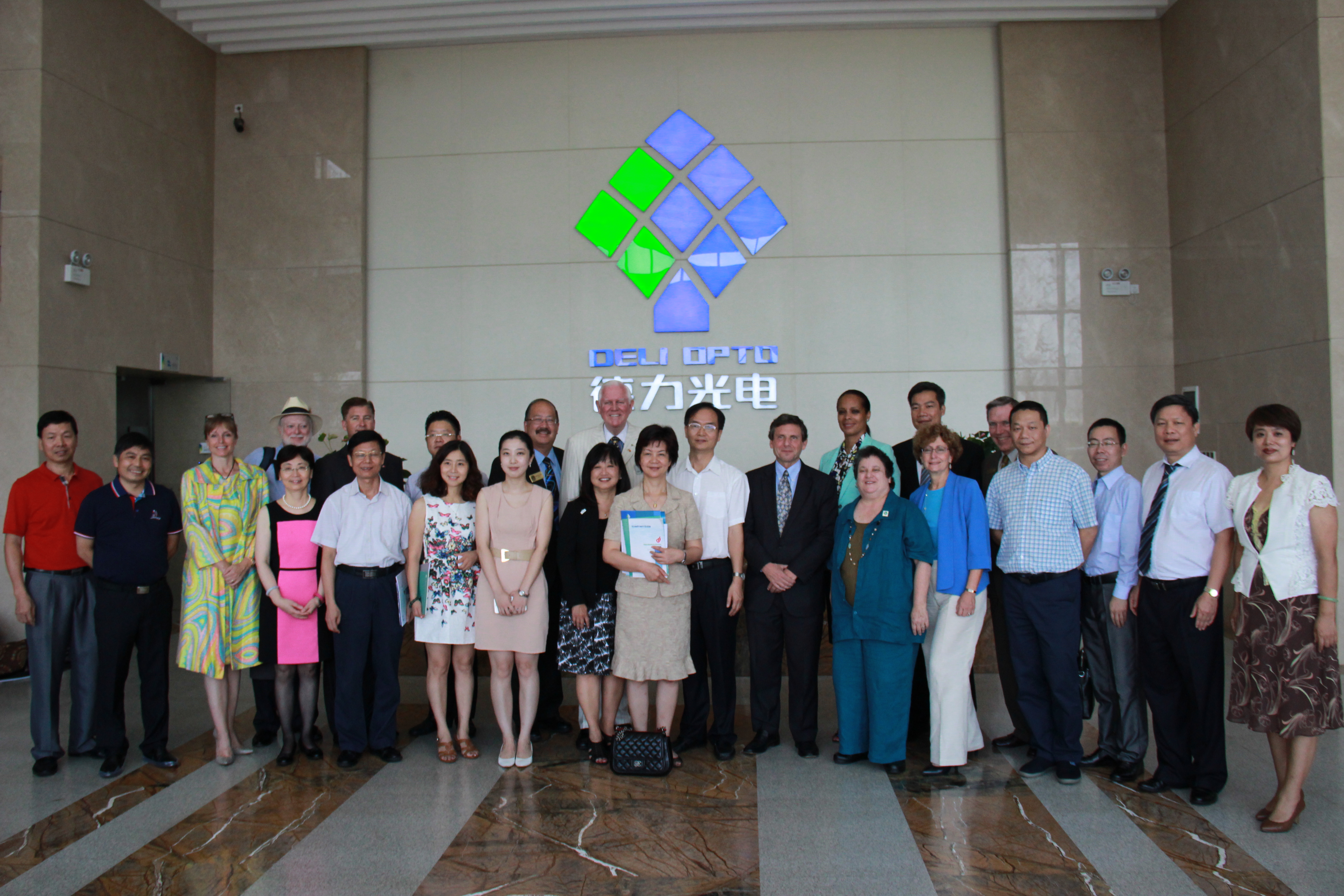參觀結(jié)束后,訪問團與市領(lǐng)導(dǎo)及公司領(lǐng)導(dǎo)在德力光電大堂親切合影留念。